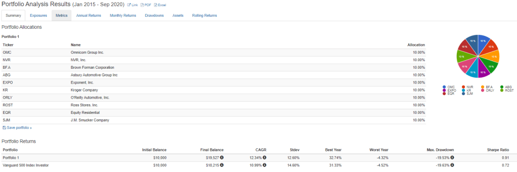 What do you know. The 10 stock portfolio has less volatility than the S&P 500 AND much lower drawdown during the panic of early 2020. Also, if you compare it to the sector matched portfolio, it still does better.