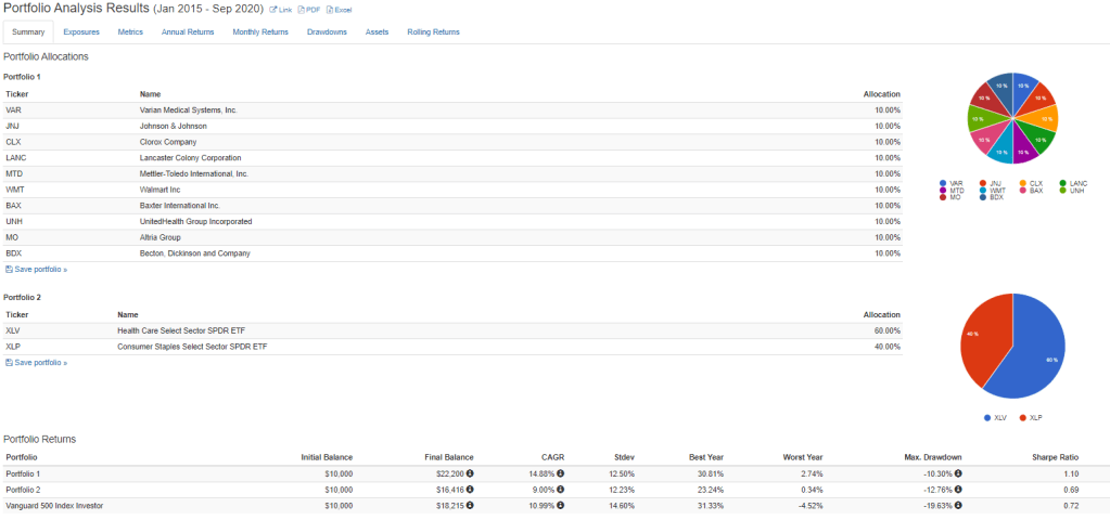 Here is another quick and fun test. Using the same 2015 screen that I used for the above selections, let’s build a random defensive portfolio. Consumer Staples and Health Care. Necessities right?